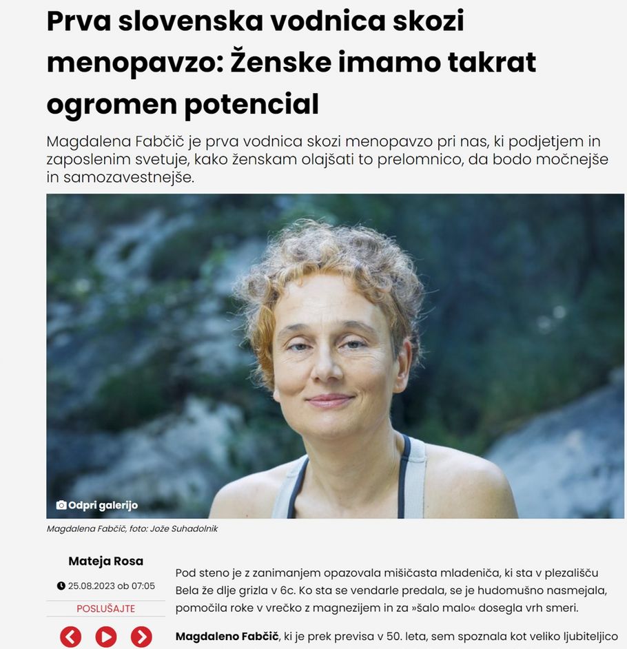 Magdaleno Fabčič, ki je preko previsa v 50. leta, sem spoznala kot veliko ljubiteljico narave, športnico, zasvojeno s plezanjem in knjigami. Je pa tudi biologinja z dolgoletnimi izkušnjami v farmacevtski industriji, coach po ACTP , facilitatorka, vodnica skozi menopavzo.
